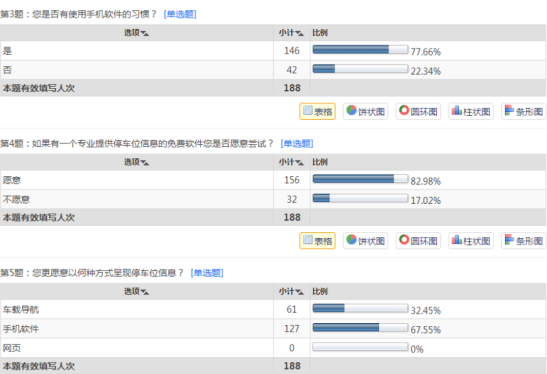 由3、4、5这几题可以看出,当有选择时用户更希望通过手机软件去找停车位,都愿意去尝试手机停车APP;相比较与传统导航系统,它能更加符合用户们对停车位的需求。