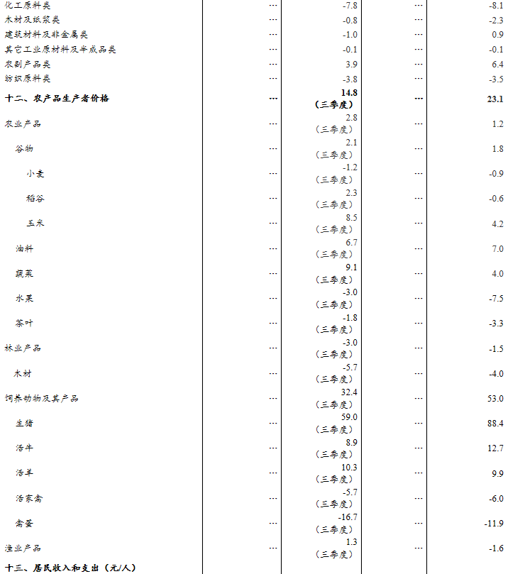 前三季度,农业(种植业)增加值同比增长3.8%,增速与上半年持平;其中,三季度增长3.9%。全国夏粮早稻产量合计17010万吨,比上年增加224万吨。秋粮播种面积稳中有增,主要秋粮作物总体长势较好,秋粮生产有望再获丰收。粮食种植结构持续优化,优质稻谷与大豆播种面积进一步扩大。前三季度,牛奶产量同比增长8.1%,禽蛋产量增长5.1%;猪牛羊禽肉产量下降4.7%,降幅比上半年收窄6.1个百分点,其中禽肉产量增长6.5%,牛肉、羊肉、猪肉产量分别下降1.7%、1.8%、10.8%,降幅分别比上半年收窄1.7、0.7、8.3个百分点。生猪生产逐步恢复。三季度末,生猪存栏37039万头,同比增长20.7%;其中,能繁殖母猪存栏3822万头,增长28.0%。