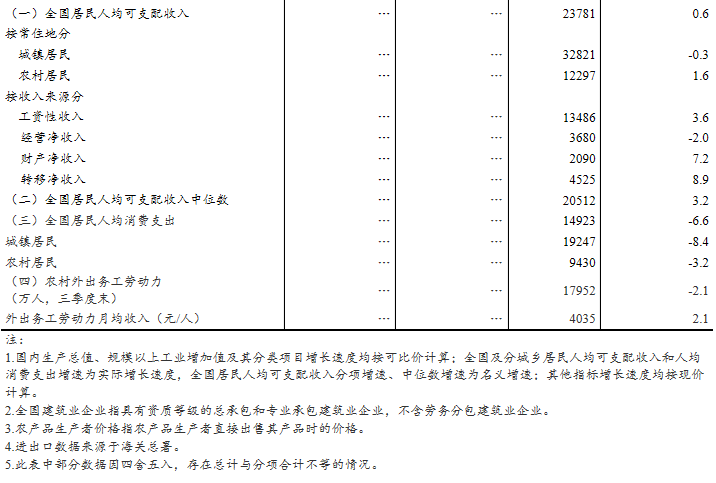 前三季度,全国居民人均可支配收入23781元,同比名义增长3.9%,扣除价格因素实际增长0.6%,年内首次转正,上半年为下降1.3%。按常住地分,城镇居民人均可支配收入32821元,名义增长2.8%,实际下降0.3%;农村居民人均可支配收入12297元,名义增长5.8%,实际增长1.6%。城乡居民人均可支配收入比值为2.67,比上年同期缩小0.08。全国居民人均可支配收入中位数20512元,同比名义增长3.2%。