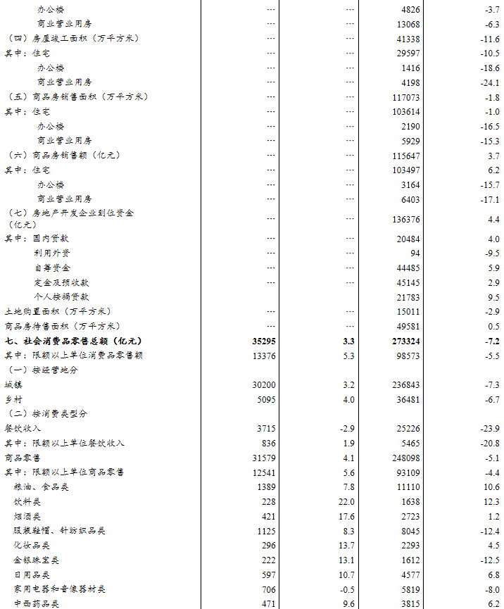 前三季度,社会消费品零售总额273324亿元,同比下降7.2%,降幅比上半年收窄4.2个百分点;其中三季度增长0.9%,季度增速年内首次转正。9月份,社会消费品零售总额35295亿元,同比增长3.3%,增速比8月份加快2.8个百分点,连续2个月增长。前三季度,按经营单位所在地分,城镇消费品零售额236843亿元,下降7.3%;乡村消费品零售额36481亿元,下降6.7%。按消费类型分,餐饮收入25226亿元,下降23.9%;商品零售248098亿元,下降5.1%。消费升级类商品销售较快增长,通讯器材类、体育娱乐用品类、化妆品类商品零售额分别增长7.2%、6.8%、4.5%。前三季度全国网上零售额80065亿元,同比增长9.7%,增速比上半年加快2.4个百分点。其中,实物商品网上零售额66477亿元,增长15.3%,占社会消费品零售总额的比重为24.3%。