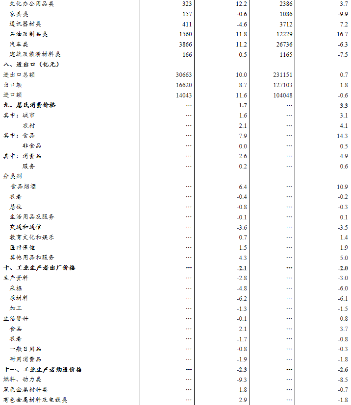 前三季度,全国工业生产者出厂价格同比下降2.0%;其中9月份同比下降2.1%,环比上涨0.1%。前三季度,全国工业生产者购进价格同比下降2.6%;其中9月份同比下降2.3%,环比上涨0.4%。