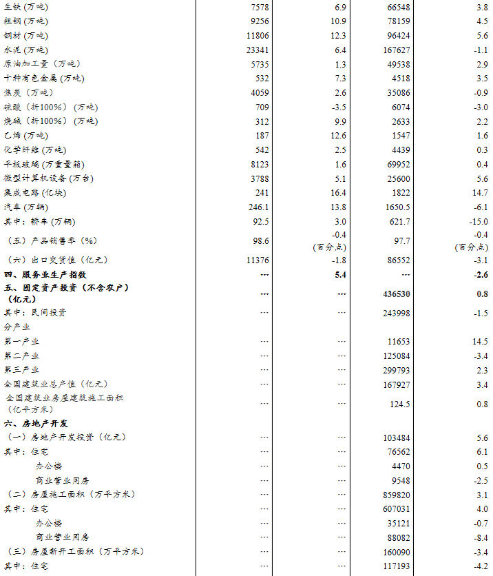 前三季度,全国固定资产投资(不含农户)436530亿元,同比增长0.8%,增速年内首次由负转正,上半年为下降3.1%。分领域看,基础设施投资增长0.2%,增速年内首次由负转正,上半年为下降2.7%;制造业投资下降6.5%,降幅比上半年收窄5.2个百分点;房地产开发投资增长5.6%,增速比上半年提高3.7个百分点。全国商品房销售面积117073万平方米,下降1.8%,降幅比上半年收窄6.6个百分点;商品房销售额115647亿元,增长3.7%,上半年为下降5.4%。分产业看,第一产业投资增长14.5%,增速比上半年提高10.7个百分点;第二产业投资下降3.4%,降幅比上半年收窄4.9个百分点;第三产业投资增长2.3%,上半年为下降1.0%。民间投资243998亿元,下降1.5%,降幅比上半年收窄5.8个百分点。高技术产业投资增长9.1%,增速比上半年提高2.8个百分点;其中高技术制造业和高技术服务业投资分别增长9.3%和8.7%。高技术制造业中,医药制造业、计算机及办公设备制造业投资分别增长21.2%、9.3%;高技术服务业中,电子商务服务业、信息服务业、科技成果转化服务业投资分别增长20.4%、16.9%、16.8%。社会领域投资增长9.2%,增速比上半年提高3.9个百分点;其中卫生、教育投资分别增长20.3%、12.7%,增速分别比上半年提高5.1、1.9个百分点。从环比看,9月份固定资产投资(不含农户)比上月增长3.37%。