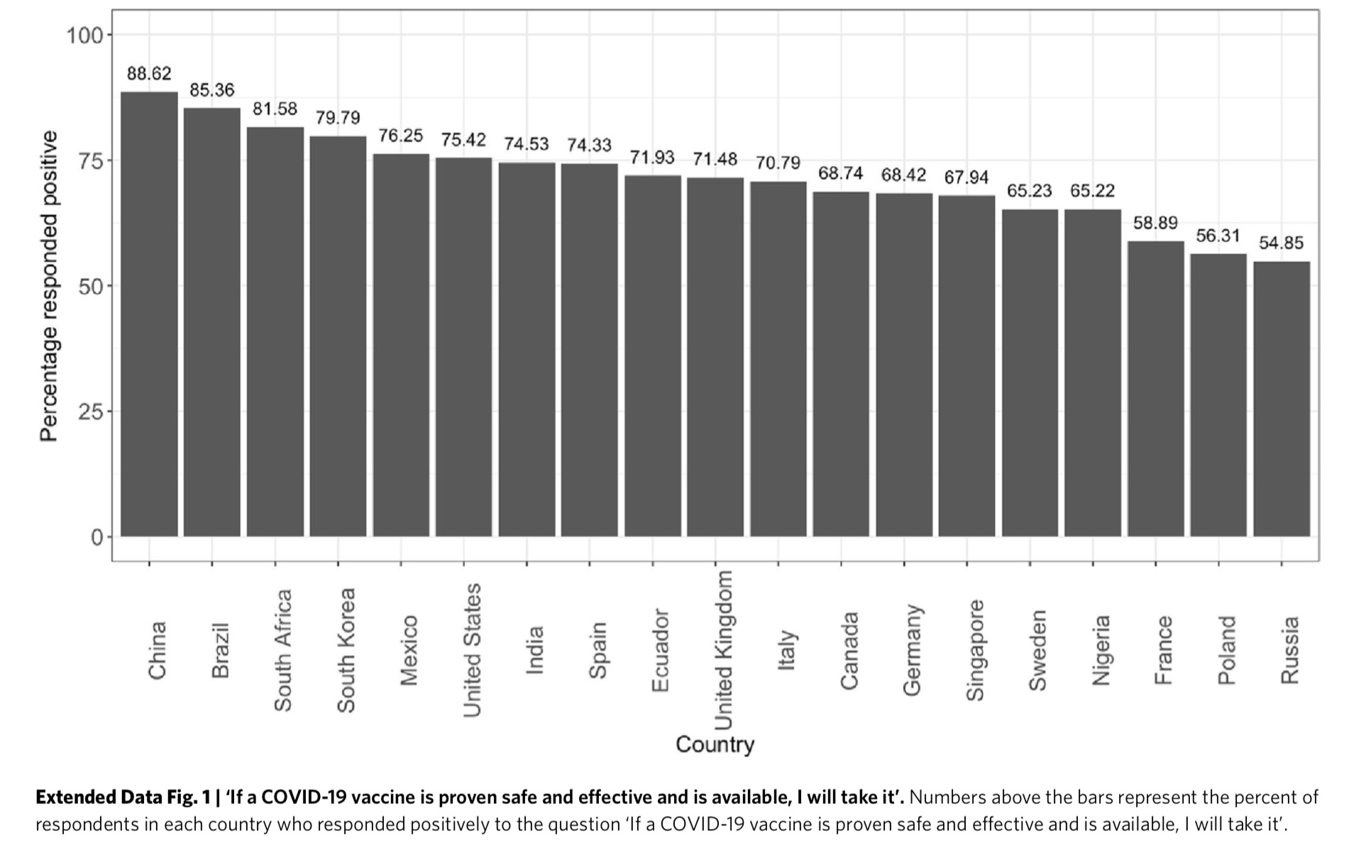 尚在等待中的新冠疫苗被认为是全球重启的关键,然而一旦有安全有效的疫苗,公众是否愿意积极接种?近日,第一个专门评估新冠肺炎疫苗全球接受度的公开研究调查得出,调查中的多个国家对疫苗接受程度不一,其中中国接受率最高,俄罗斯则为最低。
