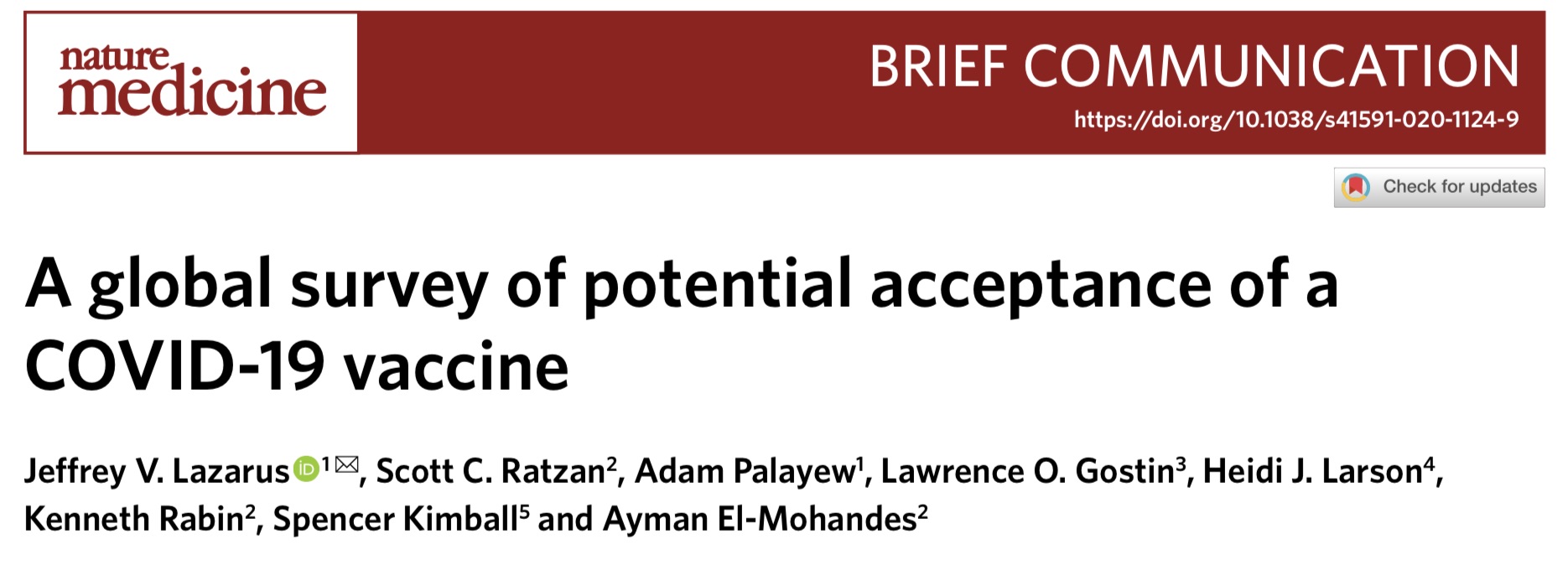 该研究题为“A global survey of potential acceptance of a COVID-19 vaccine”,通讯作者为西班牙巴塞罗那全球健康研究所的Jeffrey Lazarus教授,研究人员来自西班牙、美国、英国等团队。这是第一个专门评估新冠肺炎疫苗全球接受度的公开研究。
