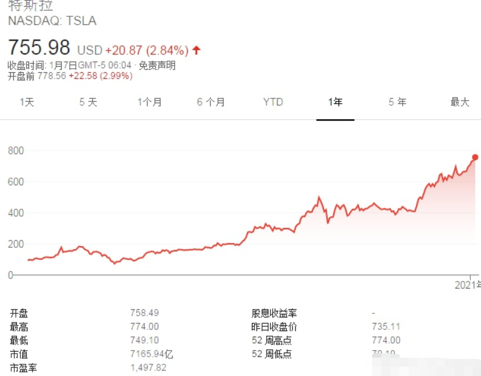 特斯拉一个月涨2355亿美元,平均每天涨62亿美元。从2020年11月30日,到2021年1月7日。特斯拉从5380亿美元涨到7735亿美元,涨幅达43%!马斯克是特斯拉公司的主要股东,拥有38658670股有益股份,持股比例为20.8%。马斯克的身价也达到了1885亿美元。马斯克年初的资产只有270亿美元,今年资产膨胀比例为685%,这真是个魔幻的世界。