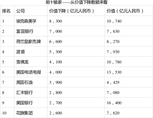 油价下跌,传统能源行业表现糟糕:“前世界最值钱企业”埃克森美孚价值下降8400亿元,即44%,跌至1万亿元,排在第61位,其次是雪佛龙、英国石油、荷兰皇家壳牌、埃尼集团和康菲石油。