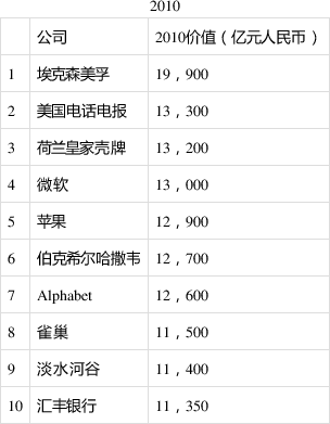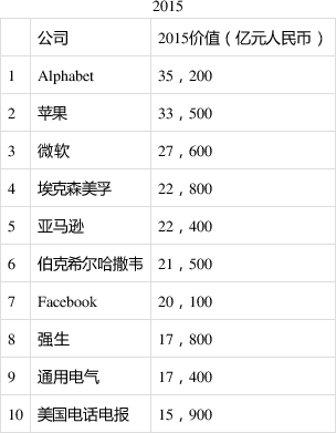 世界上价值最高的公司比十年前的公司价值高出7倍,比五年前高出4倍。十年前,世界上价值最高的公司是美国石油公司埃克森美孚,价值2万亿元;五年前,是Alphabet,价值3.5万亿元。十年前的前十名中,只有4家公司至今仍在前十名:苹果、微软、伯克希尔哈撒韦和Alphabet。