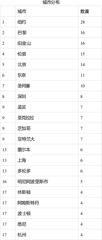 从城市来看,纽约以28家排名第一;其次是巴黎和旧金山,各有16家。前十名城市中,有2个来自中国:北京以14家位列第五,深圳以8家位列第八。上海以6家位列第13。