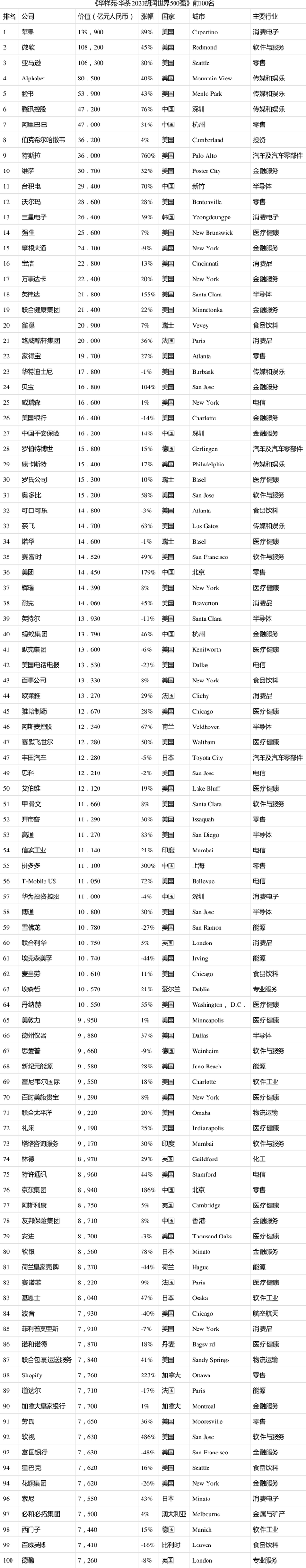 中国是世界涨幅最快的国家,51家上榜企业总价值比去年增长73%,达到35万亿元,几乎是排在其后的日本、法国和英国三个国家的总和。排名第一的是腾讯,价值4.7万亿元,阿里巴巴紧随其后,这是榜单前十中仅有的两家非美国公司,也是第一次有两家中国企业进入全球十强,五年前和十年前的前十名中一家中国企业都没有。