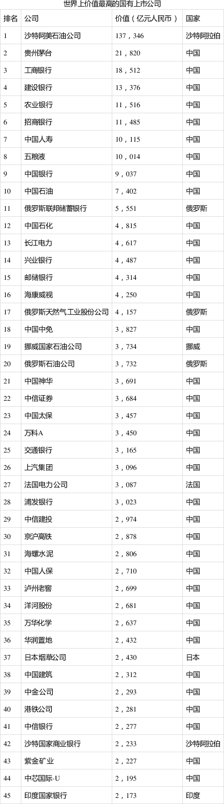 世界上有45家国有上市公司的价值都超过2105亿元,即“胡润世界500强”的上榜门槛,但因为“胡润世界500强”只包含非国有企业,因此这些企业都不在榜单上。