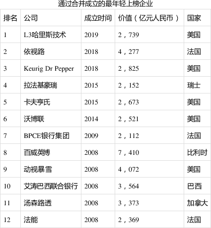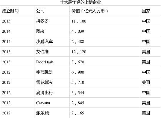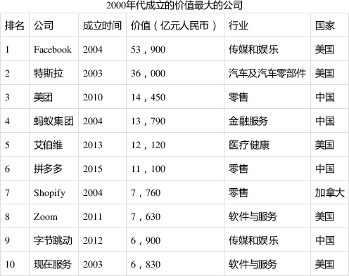 61家公司成立于2000年代,其中最年轻的是三家中国公司:拼多多仅用了五年达到1.1万亿元的价值,其次是六岁多的电动汽车蔚来和小鹏。2000年代成立的价值最大的十家公司中,4家来自中国,它们是美团、蚂蚁集团、拼多多和字节跳动。