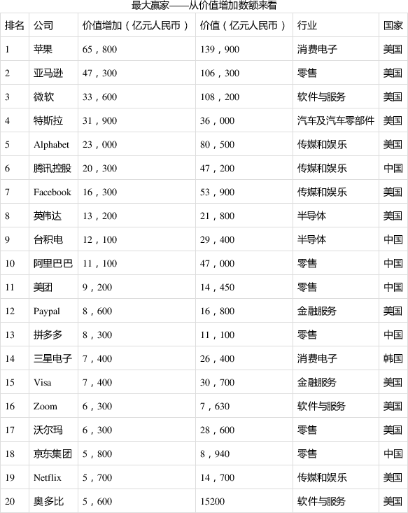 从价值增加的数额来看,最大赢家是苹果、亚马逊和微软。