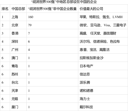 “胡润世界500强”上的非中国企业中,有266家公司,即59%,在13个中国城市设有地区总部,其中绝大多数位于上海(160家)和北京(79家),还有一些位于香港、深圳和广州。胡润表示:“还有40%多的非中国企业没有在中国设立地区总部,还有未被挖掘的机会。上海作为国际化大都市,是非中国企业在中国设立地区总部的首选城市,其次是北京。”