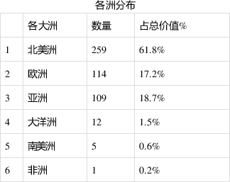 从各大洲来看,北美以259家公司排名第一。占世界人口60%以上的亚洲,排在占世界人口8%的北美和占世界人口10%的欧洲之后。欧洲和亚洲分别有114家和109家公司上榜。非洲只有1家。