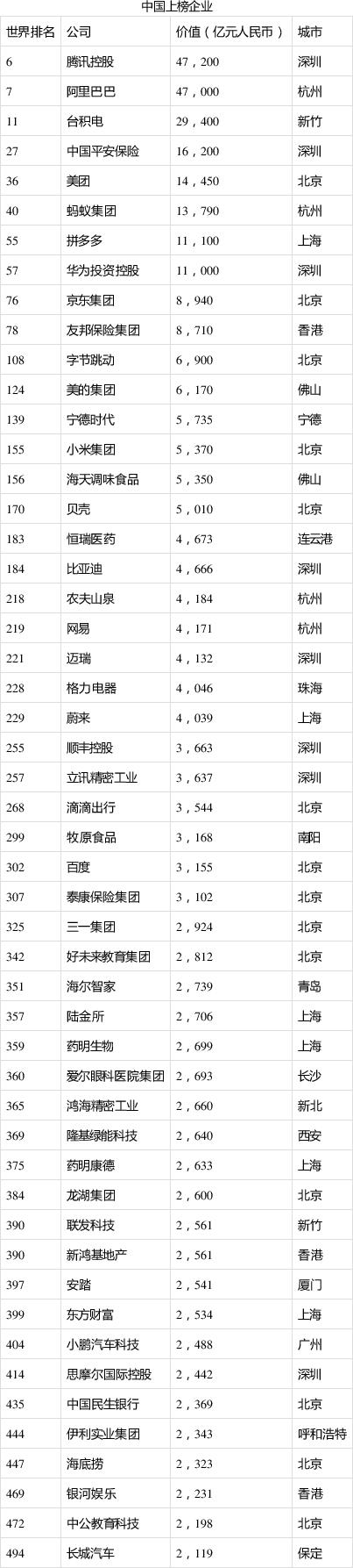 中国有51家公司进入“胡润世界500强”,以腾讯和阿里巴巴为首,这两家公司均进入世界前十名。腾讯控股排名第六,阿里巴巴排名第七,价值分别为47200亿元和47000亿元。