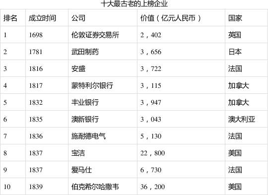 125家公司历史超过100年,其中最古老的是322岁的伦敦证券交易所和239岁的武田制药。