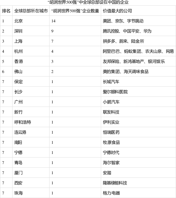 中国:中国有51家公司进入“胡润世界500强”,以腾讯和阿里巴巴为首,这两家公司均进入世界前十名。这51家中国企业分布在18个城市,以北京(14家)居首,其次是深圳和上海(9家和7家)。其他城市还包括杭州、香港和佛山等。平均年龄为24岁,远低于整个榜单64岁的平均年龄。胡润表示:“比较意外的是,香港都没有杭州多。”