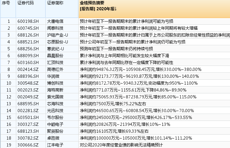 报告期内,华润微、韦尔股份分别预计实现扣非后归母净利润同比增长上限为313.59%、648.05%。