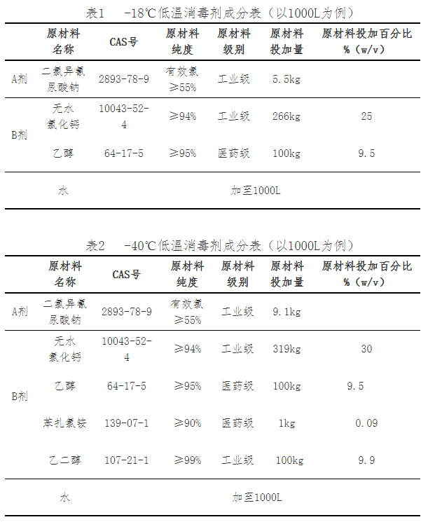 1.主要成分:包括二氯异氰尿酸钠、氯化钙和乙醇。现场使用时,-18℃低温消毒剂中有效氯浓度为0.3%(3000mg/L),无水氯化钙的含量为25%,乙醇的含量为9.5%。