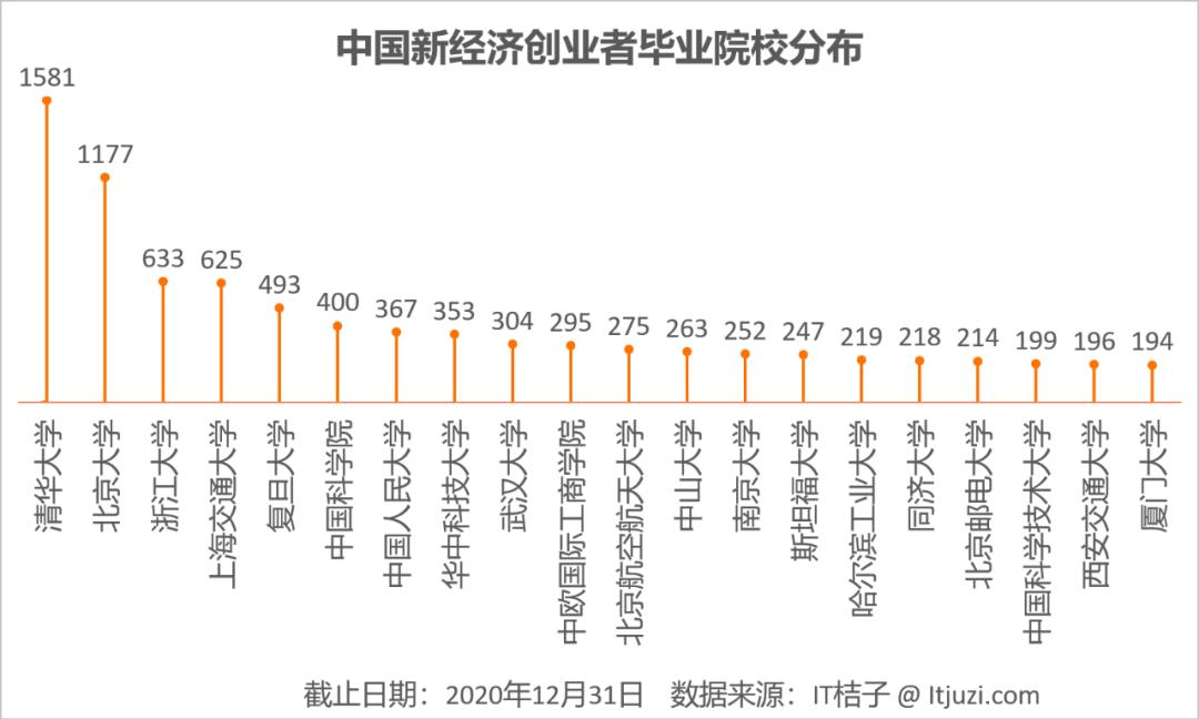 截至 2020 年 12 月底,IT 桔子共收录近 15 万 4 千条中国新经济领域活跃创业者的数据信息,包括他们的工作经历、教育背景、历史创业项目、公司融资情况等。