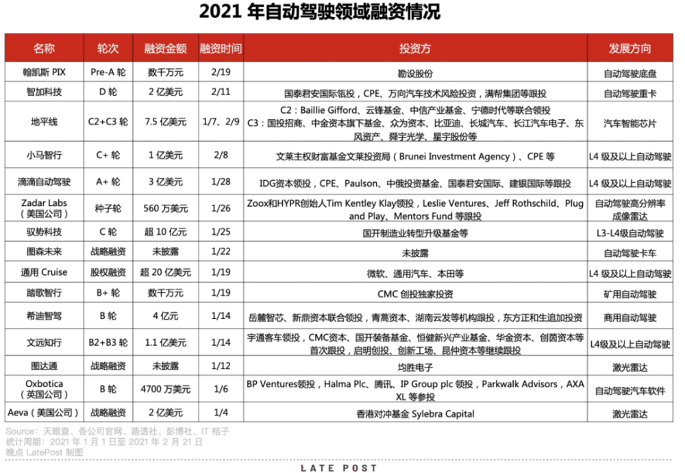 疫情之下,人们对无接触式配送、出行的需求以及政策支持推动了自动驾驶赛道的融资。据《晚点 LatePost》不完全统计,2021 年以来,在不到两个月时间里,全球自动驾驶领域已发生 15 起融资事件,总金额超 250 亿元人民币,涉及 Robotaxi (自动驾驶出租车)、港口、矿用和重卡等多个应用场景。其中,融资额最高的是新获得 20 亿美元投资的通用旗下自动驾驶公司 Cruise。