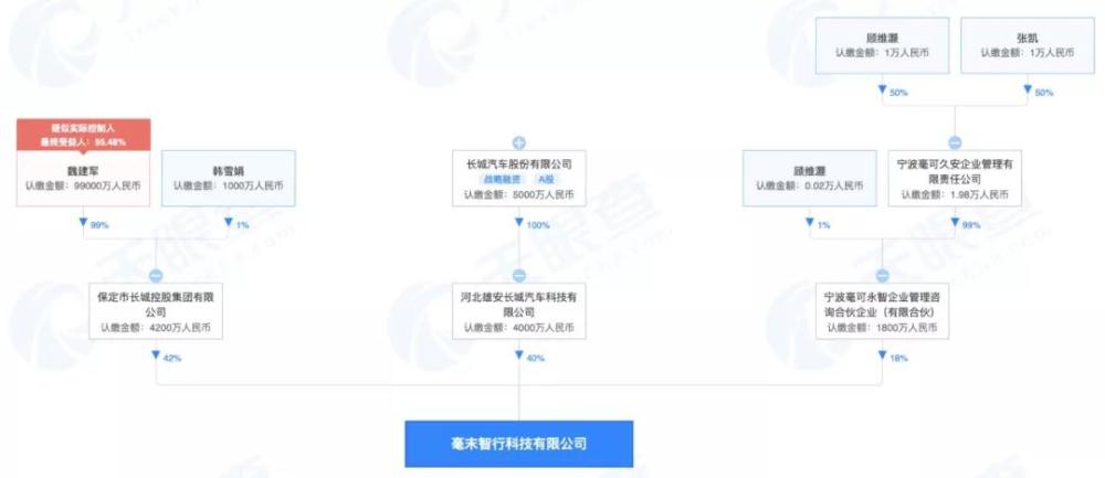 据天眼查信息,此轮投资前,由长城汽车董事长魏建军及其妻子韩雪娟分别持股 99% 和 1% 股份的长城控股(保定市长城控股集团有限公司)持有毫末智行 42% 股份,为第一大股东;长城汽车上市主体长城汽车股份有限公司则通过全资子公司河北雄安长城科技有限公司持有毫末智行 40% 股份,为第二大股东。