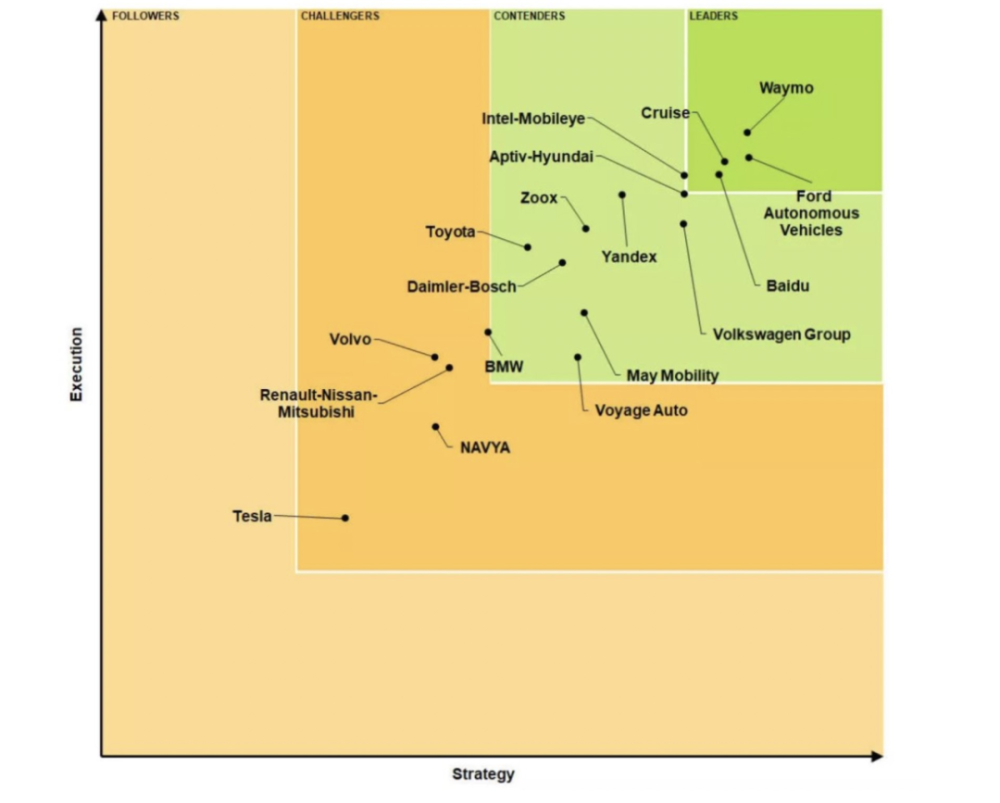 Guidehouse Insights 从 2017 年开始发布的这份榜单从十个维度综合评估自动驾驶公司的竞争力。最后以执行能力和策略能力为横纵坐标,将自动驾驶公司划分为领导者、竞争者、挑战者及跟随者。