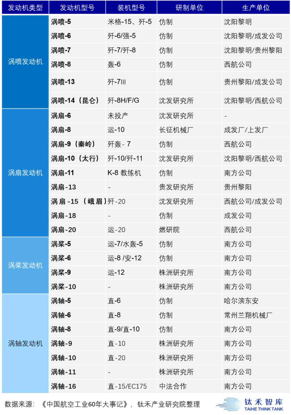 中国研制的主要军用航空发动机型号