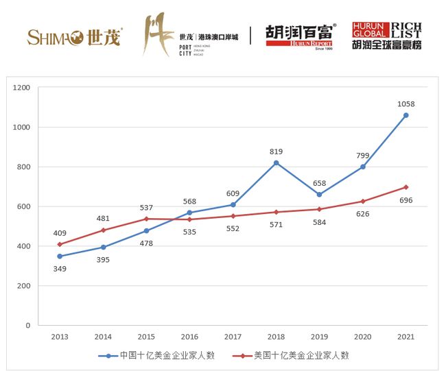 胡润百富董事长兼首席调研官胡润表示:“在过去的一年里,中国新增了256位十亿美元企业家,成为世界上第一个拥有千位已知十亿美元企业家的国家,有1056位,超过了排在其后的美国、印度和德国三个国家的总和。在过去5年里,中国新增了490位十亿美元企业家,而美国为160位。”