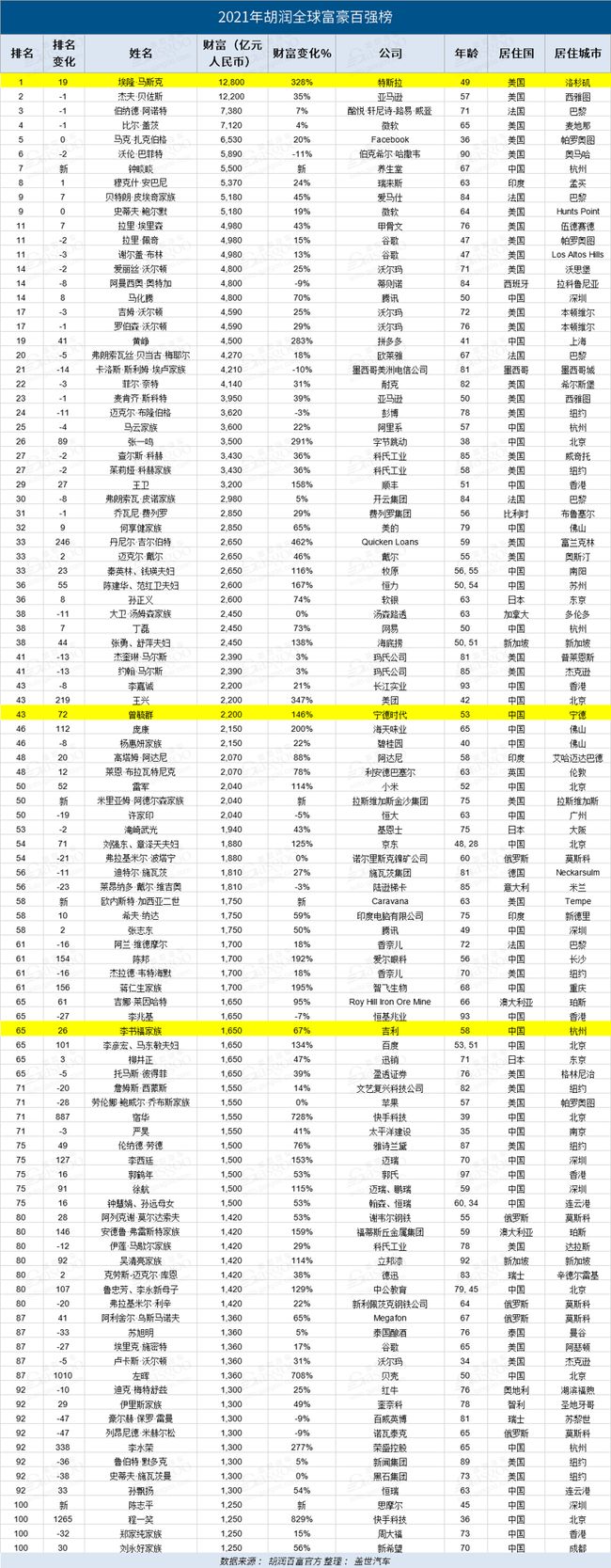 资讯速递 > 2021胡润全球富豪榜出炉!马斯克成世界首富,钟睒睒问鼎亚洲首富