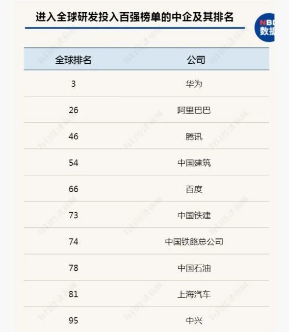 据最新出炉的2020年版榜单,进入全球研发投入前100强的中国企业为:华为(3)、阿里巴巴(26)、腾讯(46)、中国建筑(54)、百度(66)、中国铁建(73)、中国铁路总公司(74)、上海汽车(81)、中兴(95)。