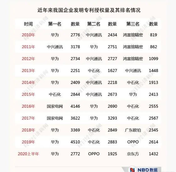 2020年,华为技术有限公司以5,464件已公布PCT申请量,连续第四年成为最大的申请人。早在2019年的专利授权量就比2013年高出一倍。2020年仅上半年的数据,几乎就相当于2010年全年。不愧是国内公认的发明专利领域“霸主”。