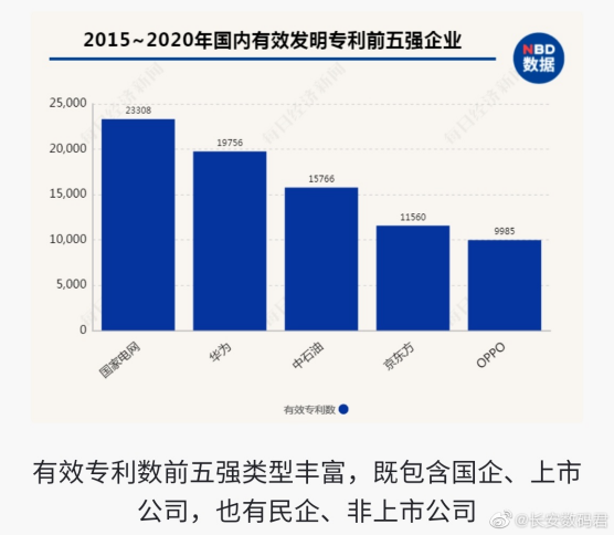 在2015年-2020年9月发明专利TOP20榜单中,国家电网以23,308件有效专利位列榜首,华为、中石化则位居第二和第三名。