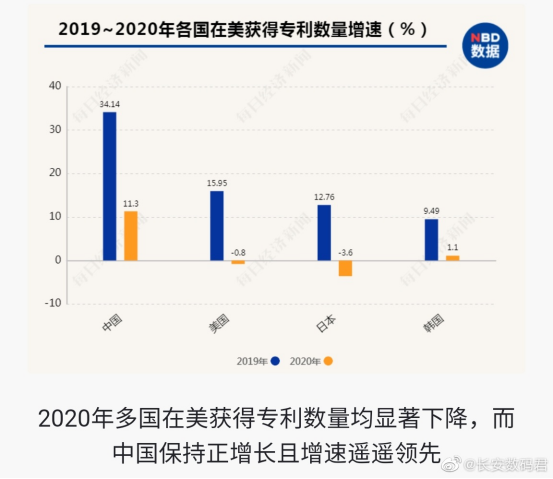 2020年,多国在美获得专利数量均显著下降,而中国保持正增长且增速遥遥领先,并连续两年成为获得美国专利数量增速最快的经济体。