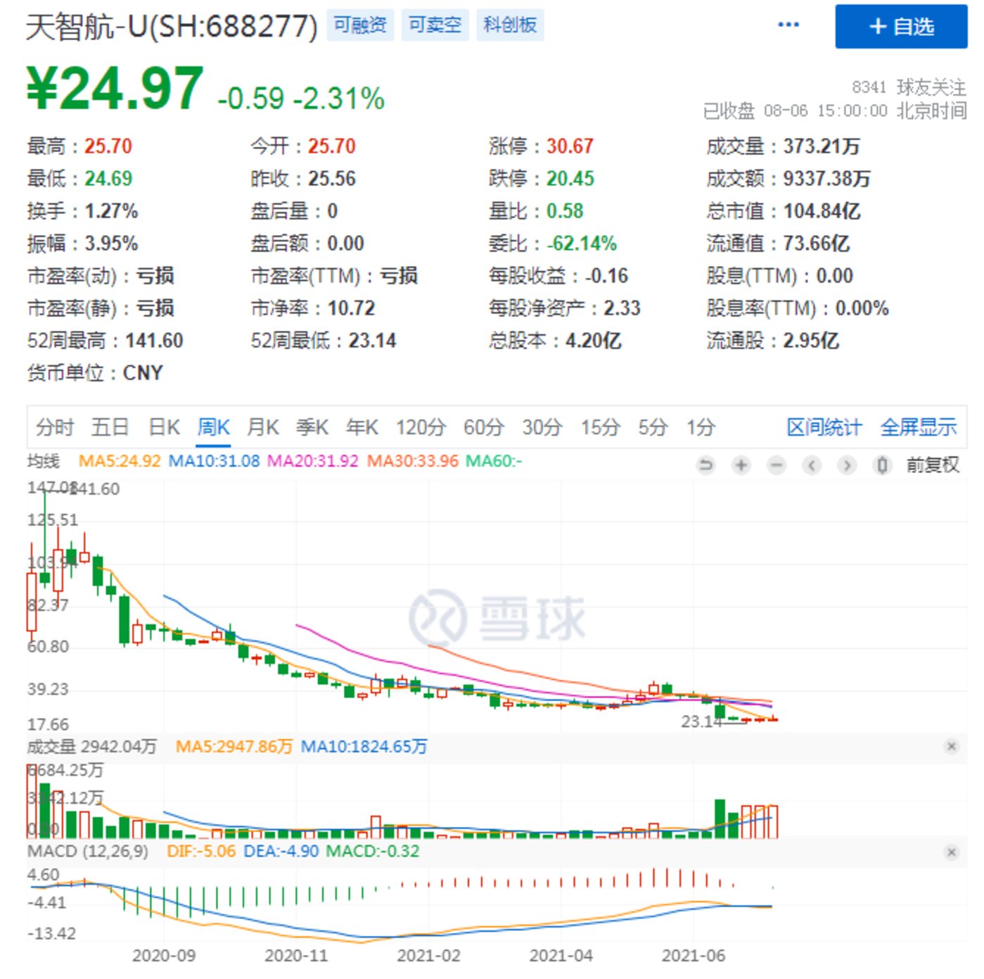 但天智航2020年年度业绩显示目前仍没有摆脱连年亏损的局面,2020年归属于母公司所有者的净利润亏损5,527.19万元,较上年同期相比扩大78.54%。二级市场上,天智航股价走势同样不容乐观。