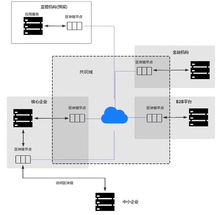 弹性的治理架构可以支持核心企业、金融机构、B2B贸易平台、政府监管机构持续加入区块链网络,构建一种行业自治、异构的安全可信数据治理架构。