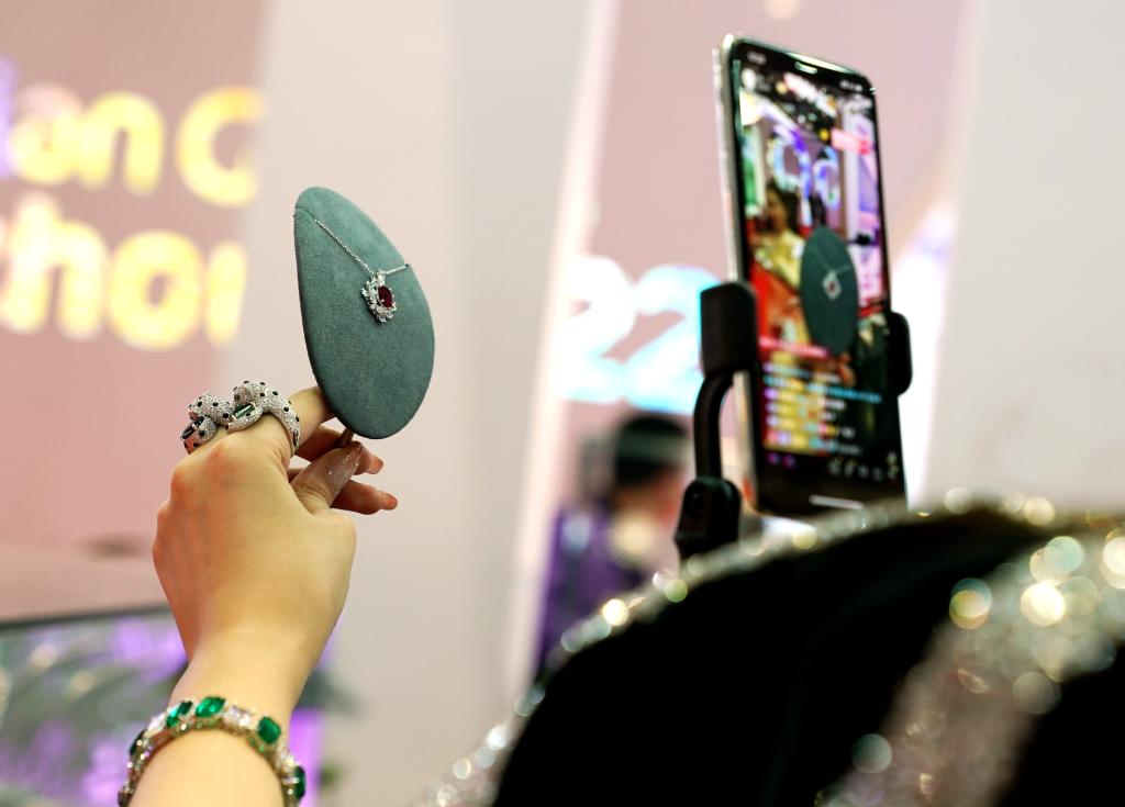 在进博会消费品展区,一家首饰参展商的工作人员在进行“双11”活动直播。