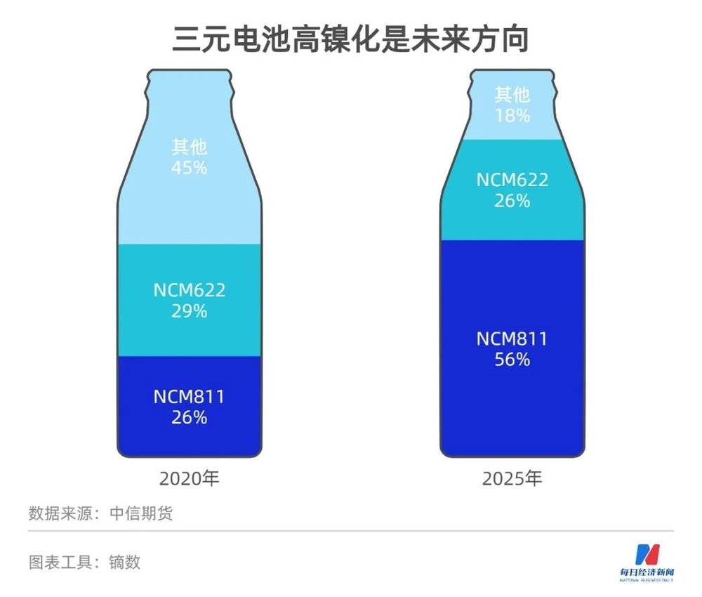 中信期货数据显示,2020年NCM811(镍钴锰占比为8:1:1)和NCM622这两种高镍材料占三元材料的比例分别为26%和29%。预计到2025年,NCM811的占比将提高到56%,而NCM622将占比将下降至26%。