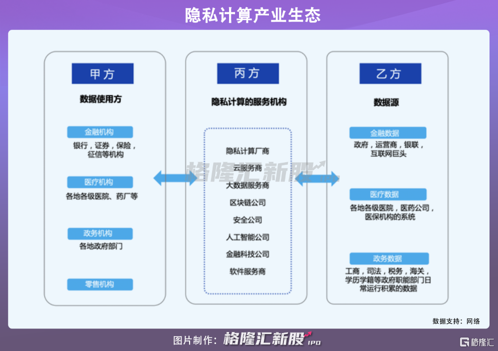 现阶段,隐私计算主要还是一个To B市场,作用在企业与企业之间的数据交互,整个产业生态包括甲乙丙三方,分别为数据使用方、数据源和隐私计算服务机构。