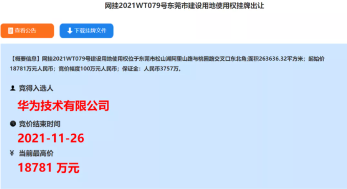11月29日,中国证券报·中证金牛座记者从东莞市公共资源交易网获悉,11月26日,华为成功竞得东莞市松山湖一宗产业用地2021WT 079。该地块位于东莞市松山湖阿里山路与桃园路交叉口东北角,11月23日,华为以18781万元参与竞拍。