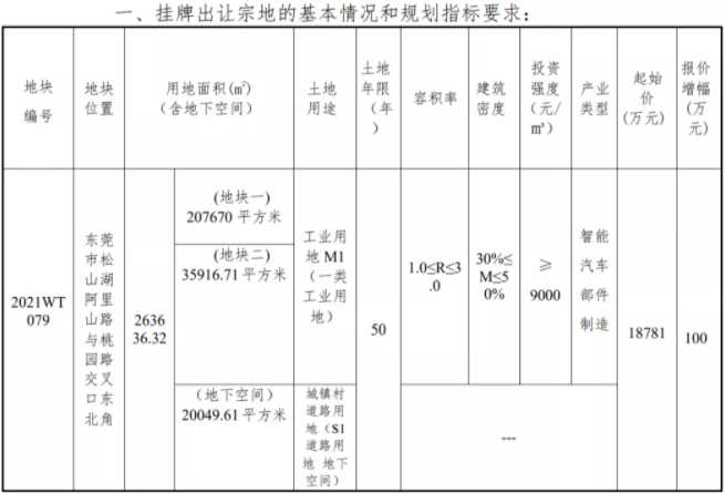 公告显示,2021WT 079地块用地面积为26.36万平方米,土地用途为工业用地(M1 一类工业用地)、城镇村道路用地(S1 道路用地);出让年限50年;产业类型为智能汽车部件制造;竞拍起始价为18781万元。这也意味着,华为以底价竞得该地块。