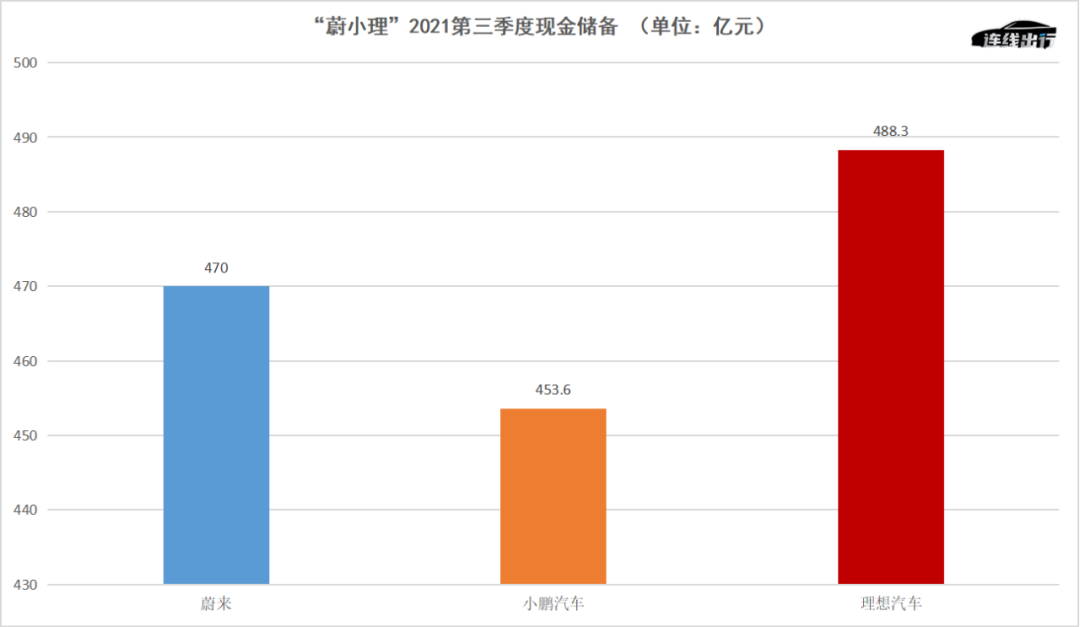 而在现金储备上,今年第三季度“蔚小理”三兄弟都已迈过了400亿元的门槛,这其中理想以488.3亿元位居首位。
