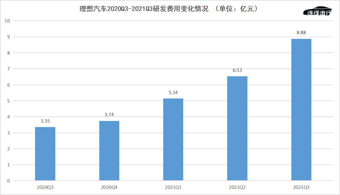 理想汽车2020Q3-2021Q3研发费用变化情况,连线出行制图
