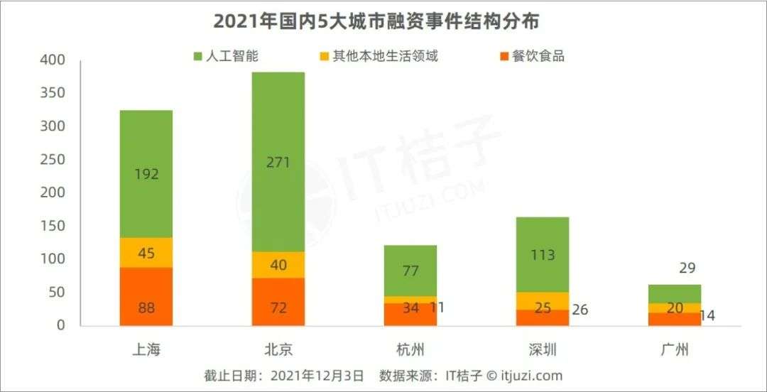 数据或许可以更直观地告诉我们一些现象,通过观察「北上广深杭」这 5 大城市在 2021 年的融资结构,并以人工智能和本地生活两大领域来代表这座城市的科技发展程度、人文生活气息,可以发现北京和上海在体量上相当,最具可比性。