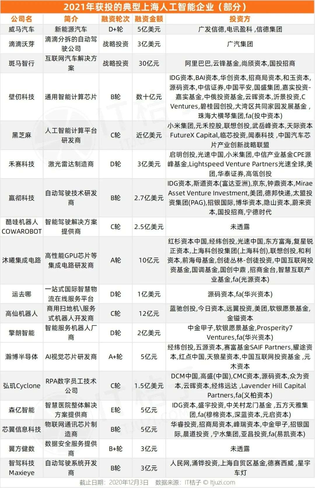 IT 桔子数据显示,2021 年,上海人工智能领域投融资事件有 192 起,涉及的资方数量约 600 家,获投公司包括自动驾驶研发公司斑马智行、芯片公司壁仞科技、服务机器人研发厂商高仙机器人等等。