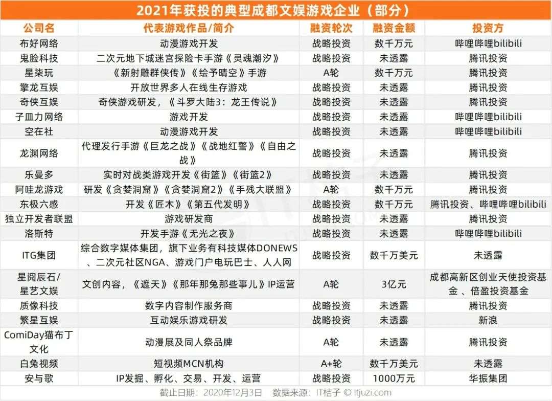 首屈一指的便是游戏项目。2021 年成都有 13 家游戏公司获得了投资,他们基本被腾讯和 B 站「包圆」了——其中,腾讯就投资了 9 家公司,包括鬼脸科技、奇侠互娱、擎龙互娱、东极六感等。