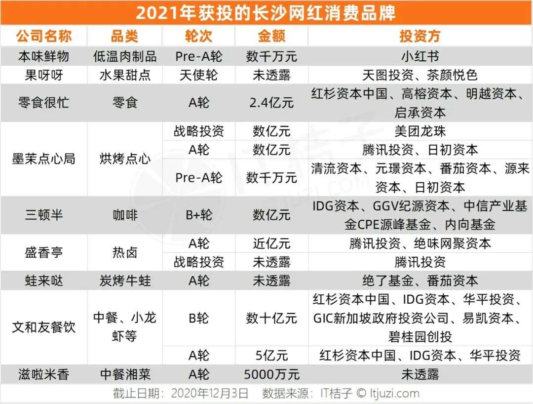 今年至少有 40 个投资方的团队去长沙看并且投了新消费项目,他们最终敲定了 9 个品牌的投资,包括网红咖啡品牌三顿半,网红现烤点心品牌墨茉点心局以及文和友餐饮,他们俨然是长沙新锐网红品牌的代表。此外,腾讯还在今年投资了长沙一家热卤品牌「盛香亭」。