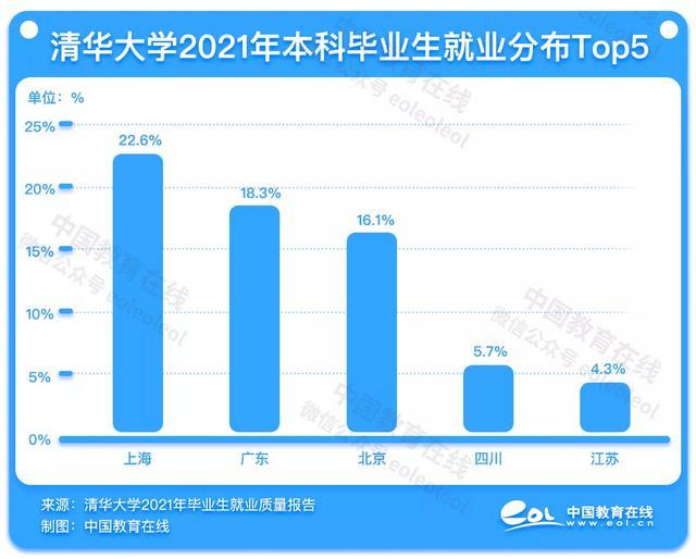 另外,有18.3%的清华毕业生选择到广东,有22.6%的清华学子选择了到上海就业发展,占比均超过北京。上海成为清华2021届本科毕业生最受欢迎的城市。北京对于清华学子的吸引力下降明显。