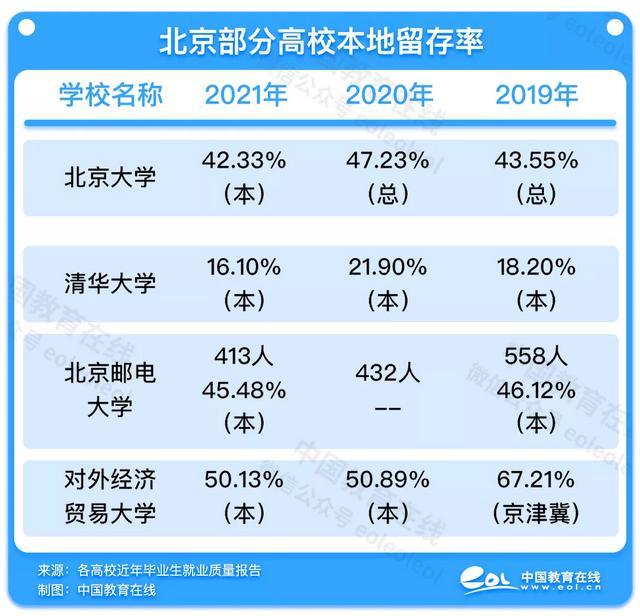 其实不止清北,其他已发布2021就业质量报告的北京高校如北京邮电大学、对外经济贸易大学等,毕业生留京人数也持续下降。
