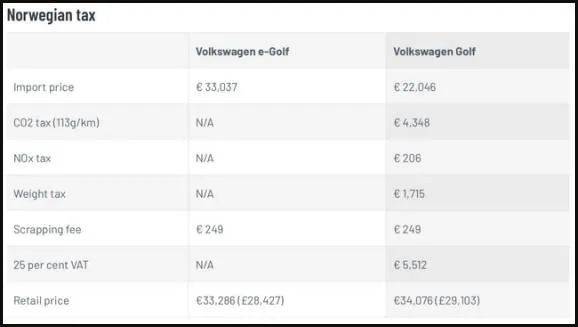 比如大众曾在挪威引进两版高尔夫,燃油版进口价2.2万欧元,纯电动e-Golf(2020年停产)进口价3.3万欧元;虎税之下,燃油版零售价高达3.4万欧元,而电动版仅需3.3万零249欧元(报废费)。